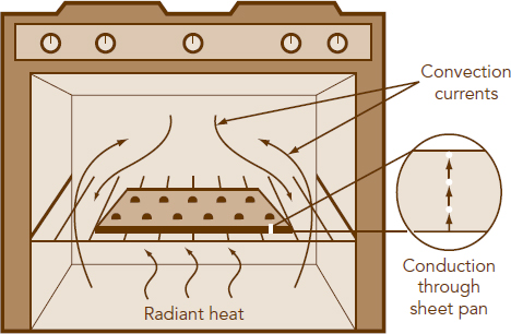 The three main ways that heat is transferred from its source to food are radiation, conduction, and convection. Most methods of cooking and baking, including simmering, sautéing, frying, and oven baking, rely on more than one means of heat transfer (Figure 2.1). A fourth type of heat transfer, induction, takes place on special stovetop surfaces. Each of these means of heat transfer is explained in this section.