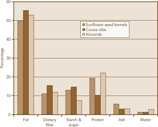Like most nuts and seeds, cocoa nibs contain valuable nutrients. Figure 15.2 compares the makeup of roasted cocoa nibs to roasted almonds and sunflower seeds. Although there are some differences (most notably, almonds are highest in protein), there are many similarities. All are very high in fat and low in water, and all are a good source of dietary fiber and minerals (ash).