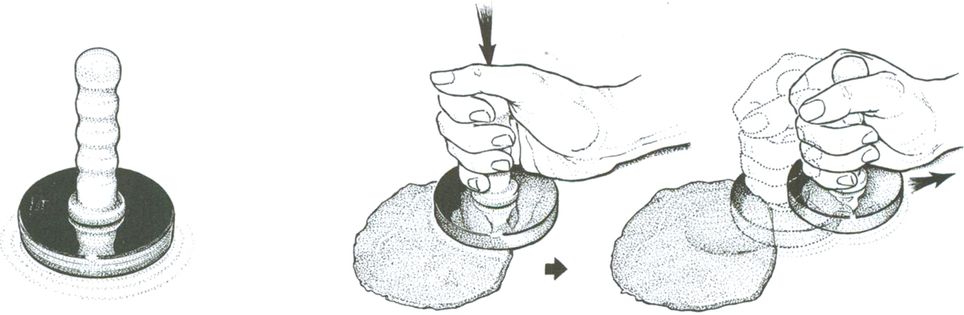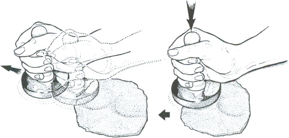 Use a meat pounder that has the handle perpendicular to the disk. Aim the edge of the pounder at the center of the meat and direct the pounder down and away from the center of the meat in smooth even strokes, as if you were tracing the spokes of a wheel.