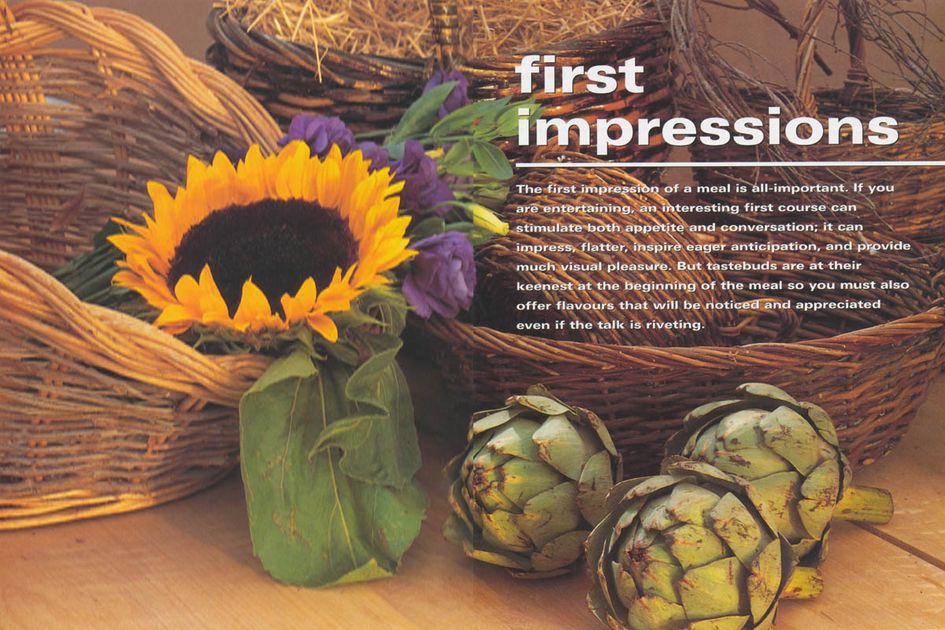 The first impression of a meal is all-important. If you are entertaining, an interesting first course can stimulate both appetite and conversation; it can impress, flatter, inspired eager anticipation, and provide much visual pleasure. But tastebuds are at their keenest at the beginning of the meal so you must also offer flavours that will be noticed and appreciated even if the talk is riveting.