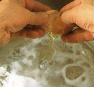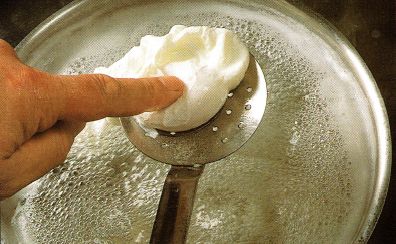 Lift out the eggs and trim the ragged white with a knife or scissors. Keep the eggs in water and drain them on paper towels just before using.