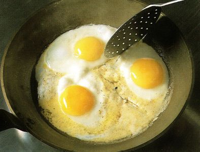 Fry the eggs over medium heat, basting with fat if you like, until the egg white is firm and the yolk still soft. The underside should be lightly browned and crisp.