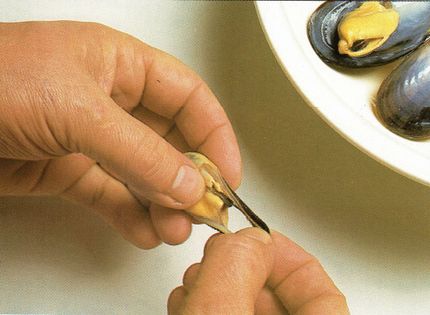 Steam large mussels until they open. Discard one shell, remove the mussel from the remaining shell and pull off the rubbery ring surrounding it. Replace the mussel in the shell for serving.