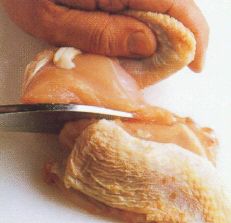 For 6 pieces: cut the bird into 4 pieces and trim as above. Cut the legs in half through the joint, between the thigh and the drumstick, using the line of white fat on the underside as a guide.