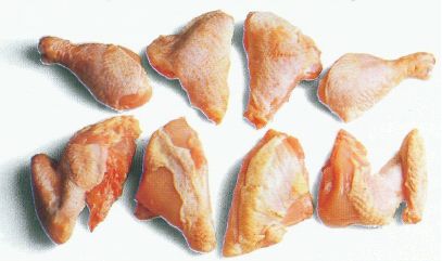 For 8 pieces: divide each breast in half diagonally with poultry shears or a knife, cutting through the breast and rib bones so that a portion of breast meat is cut off with the wing.