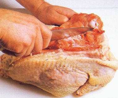 Continue cutting the breast meat away from the bone until you reach the ridge of the breastbone, where the skin and bones meet. Turn the bird round and repeat on the other side. At the end, the meat will be detached from the carcass and the skin will cling only along the ridge of the breastbone.