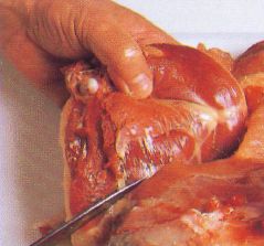 Cut the flesh from the saber shaped bone near the wing, and remove the bone.