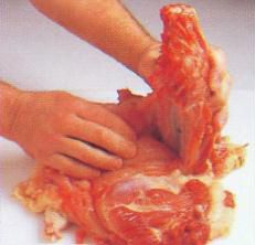 Carefully cut and pull the flesh and skin away from the carcass, working evenly with short sharp strokes of the knife. After each cut, ease the flesh and skin away from the carcass with your fingers.