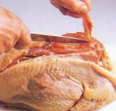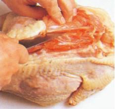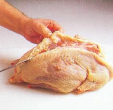 With a boning knife, cut off the wing tip and middle section, leaving the largest wing bone. With the breast of the bird down, slit the skin along the backbone from neck to tail. Cut out the wishbone.