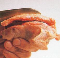 Small birds are spatchcocked—split and flattened, often on skewers—as an attractive presentation for baking or broiling. The French call it en crapaudine, since, with a stretch of the imagination, the bird resembles a flat toad or crapaud.