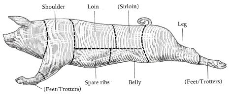 A pig can be divided into five segments that do not always correspond to retail cuts. See Pork cuts.