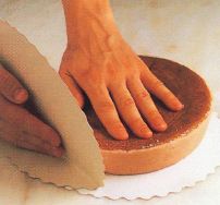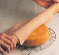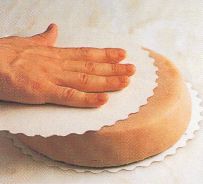 Set the cake on a round of cardboard on a rack and brush it with apricot glaze. Sprinkle the work surface lightly with confectioners’ sugar and roll the paste to a thin round with a heavy rolling pin. Brush excess confectioners’ sugar from the surface.
