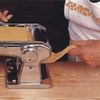 Fit the thinning rollers, the pair of smooth cylinders, into the pasta machine and set them at their largest opening. Pummel one of the pieces of dough with your palm to flatten it; then run it through the machine (photo G). Fold the dough twice, reducing its length by two-thirds, and feed it by its narrower end through the machine once again (photo H). Repeat the procedure, turning the dough back into the machine two or three times, thus duplicating hand kneading. Then lay the strip of pasta perfectly flat over a towel on the counter. Start at one end of the counter, leaving room for the strips to come.