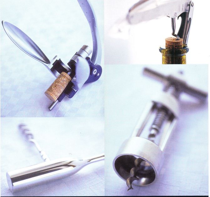 THE LATEST CORKSCREW DESIGNS Clockwise from top right: the Waiter’s friend; a double-screw corkscrew; a basic corkscrew; and the twin-lever (or “wing”) corkscrew. There are many fashionable variations of these basic designs, but they work in essentially the same way.