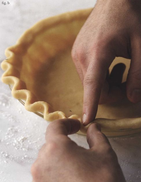 b. Using the thumb and forefinger of one hand, pinch the outside of the dough around the forefinger inside the edge of the dough to form crimping.