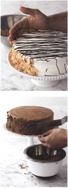 Press chopped or sliced nuts against the side of a cake with the palm of your hand. For the top, scatter them evenly, then use an offset spatula to spread them perfectly straight and to sweep away the excess. Use a metal spatula to press chocolate shavings against the side of a cake—if you use your hand they will melt. Follow the same procedure for covering the top as for nuts.