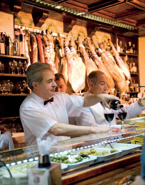 SPAIN IS A NOCTURNAL NATION. SPANIARDS DON’T EAT DINNER UNTIL 10 O’CLOCK AT NIGHT. LUNCH IS NEVER TAKEN BEFORE 2 PM. BREAKFAST IS A QUICK COFFEE AND A PASTRY EATEN SOMETIME IN THE MORNING. SPAIN SHARES ITS TIME ZONE WITH THE REST OF EUROPE, WHICH MEANS IN SPAIN IT GETS DARK LATE — A SORT OF PERMANENT DAYLIGHT SAVING. A WHOLE STYLE OF EATING HAS EVOLVED TO SUIT THIS ELONGATED TWILIGHT AND IT’S CALLED TAPAS. I’M SURE EVERYONE IS FAMILIAR WITH TAPAS — SNACK FOOD THAT IS EATEN WITH A DRINK IN SPANISH BARS. SMALL PIECES OF VERY TASTY FOOD, PERHAPS A FEW BITES, NEVER MORE THAN A MOUTHFUL.