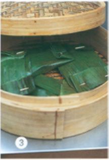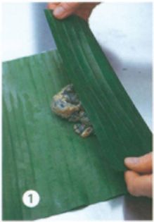 How did people in Asia steam things in parcels before cooking foil was invented? They used banana leaves, of course, and still do (❶, ❷, ❸ below). Wrapping a big fish in a banana leaf is quite tricky, but small parcels are easy. In West Java, we steam prawns this way with grated fresh coconut, you can use desiccated coconut if you wish.