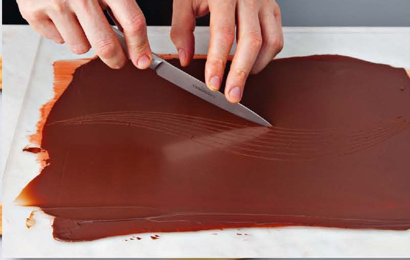• Spread the acetate with your desired colour of cocoa butter, then chocolate. Cut the semi-set chocolate into elongated ‘s’ shapes across the length of the acetate.