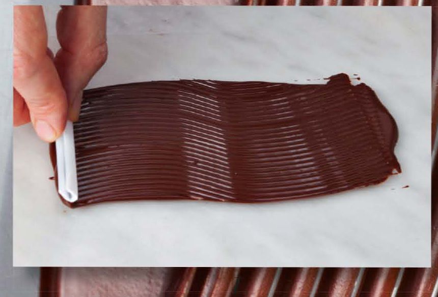 - Once the combed chocolate is semi-set, carefully lift and wrap it around a metal rolling pin, with the chocolate against the tube. (2)