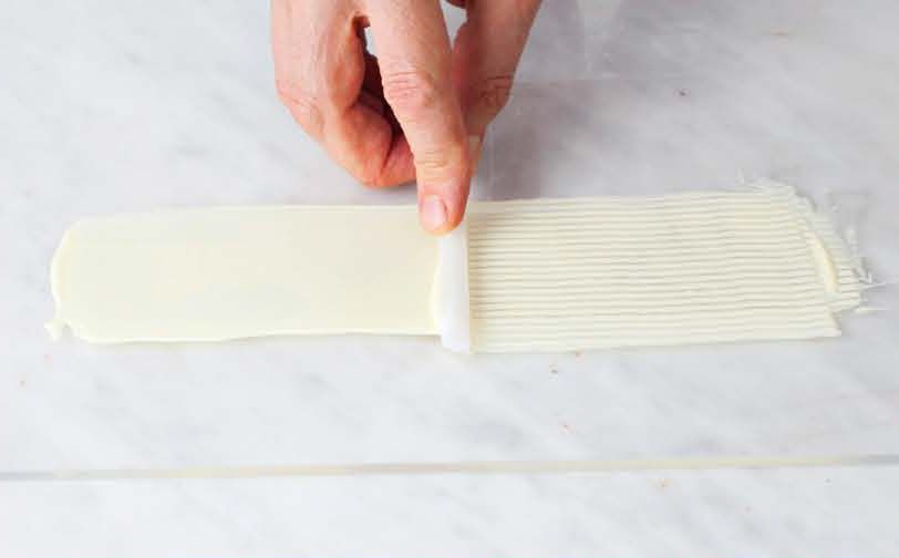 - Cut a strip of acetate to 4 x 22cm (1½ x 8¾ inches). Spread and comb the chocolate as above. (1)