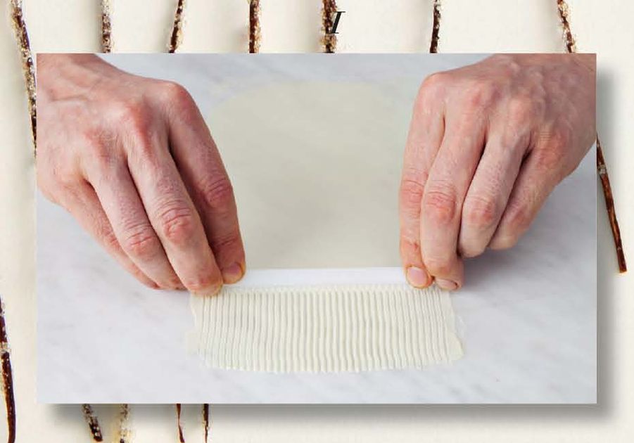 Spread a thin layer of tempered white chocolate onto a marble or granite slab using a step palette knife and leave to semi-set. Using a comb scraper, drag vertically down, creating stripes. (1)