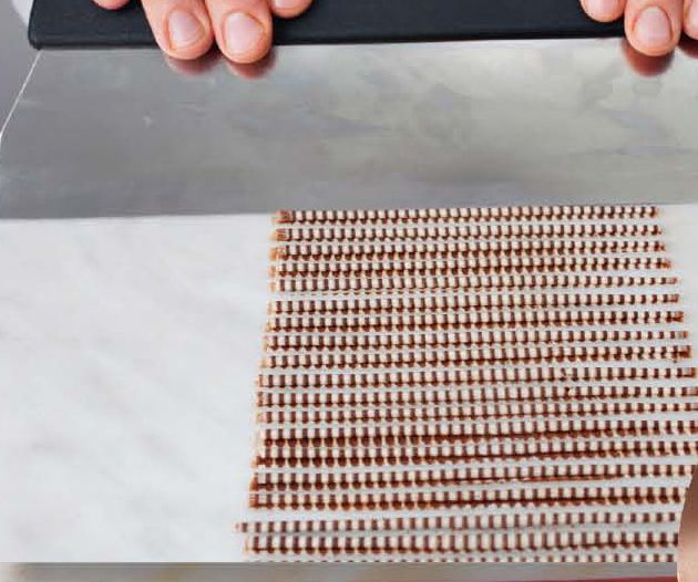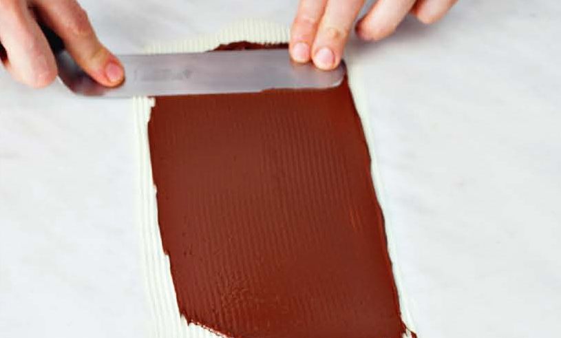 On top of the white chocolate stripes spread a thin layer of dark chocolate to fill the newly made gaps and leave to semi-set. (2)