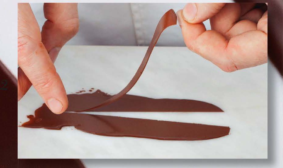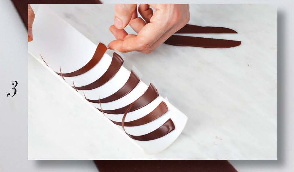 Cut out long thin triangles of your desired size from a sheet of acetate. Spread each triangle with a thin layer of tempered chocolate using a step palette knife. Leave to semi-set. (1)