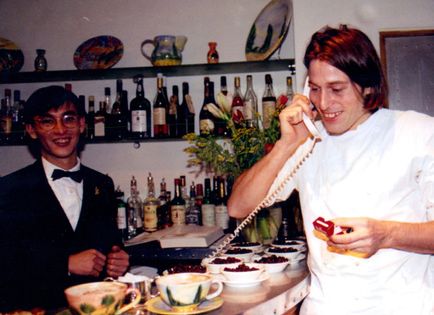 Stardust memories: sommelier Bruno Asselin with Richard Neat in 1993 being congratulated on winning the first Michelin star (Ceramics by Suzanne Katakuda)