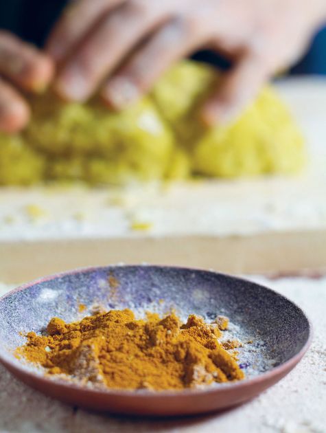Spices add color and flavor to dishes, including breads like the challah being kneaded here.