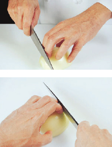 Figure 7.6 The position of the guiding hand, which holds the item being cut or sliced and also guides the blade, from two points of view.