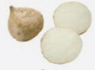 Jícama (HEE kama) is a large, round tuber with a thin brown skin and crisp, mild, juicy, creamy white flesh similar to water chestnuts.