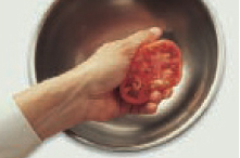 Preparation: For use with skin on: Wash, remove core. To peel: Plunge into boiling water 10–20 seconds (riper tomatoes take less time). Cool immediately in ice water. Slip skins off and remove core. (Note: Many chefs core the tomatoes and cut a shallow x in the skin at the bottom before blanching in boiling water. Other chefs, wishing to avoid even the slightest loss of flavor and nutrients from the exposed flesh into the water, first blanch the tomatoes and then core them and pull off the skins, which slip off just as easily.) See Figure 10.17 for further techniques.