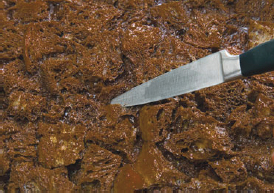 - To test for doneness, insert a thin-bladed knife 1–2 inches (3–5 cm) from the center (Figure 36.6). If it comes out clean, the custard is done. The center may not be completely set, but the custard will continue to cook in its own heat after removal from the oven.