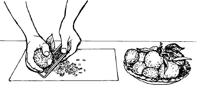 Grated citrus zest is produced by lightly grating the fruit over the very tiny holes on a box grater or hand grater, taking care not to remove any more of the white pith than is necessary. Turning the fruit as you work so that you grate the peel in a new spot with each stroke facilitates that result (Figure 1-9 ).