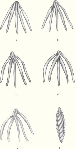 Repeat steps 2, 3, 4 until the braid is finished (e, f).