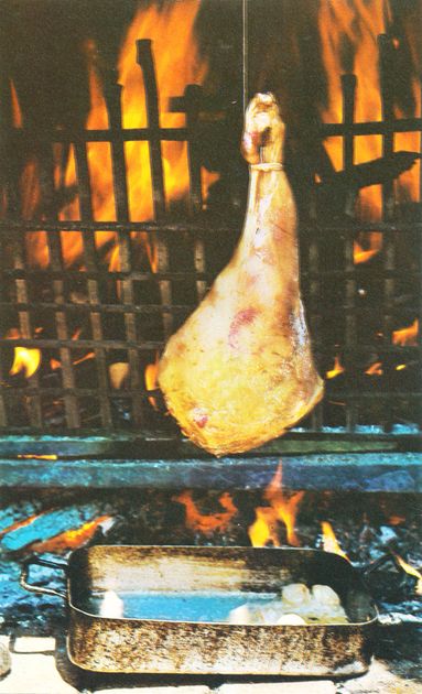 Here, a succulent leg of tender lamb is being cooked to moist, pink perfection “à la ficelle”, before the traditional vertical grill at the Les Oliviers restaurant in Saint Paul de Vence.
