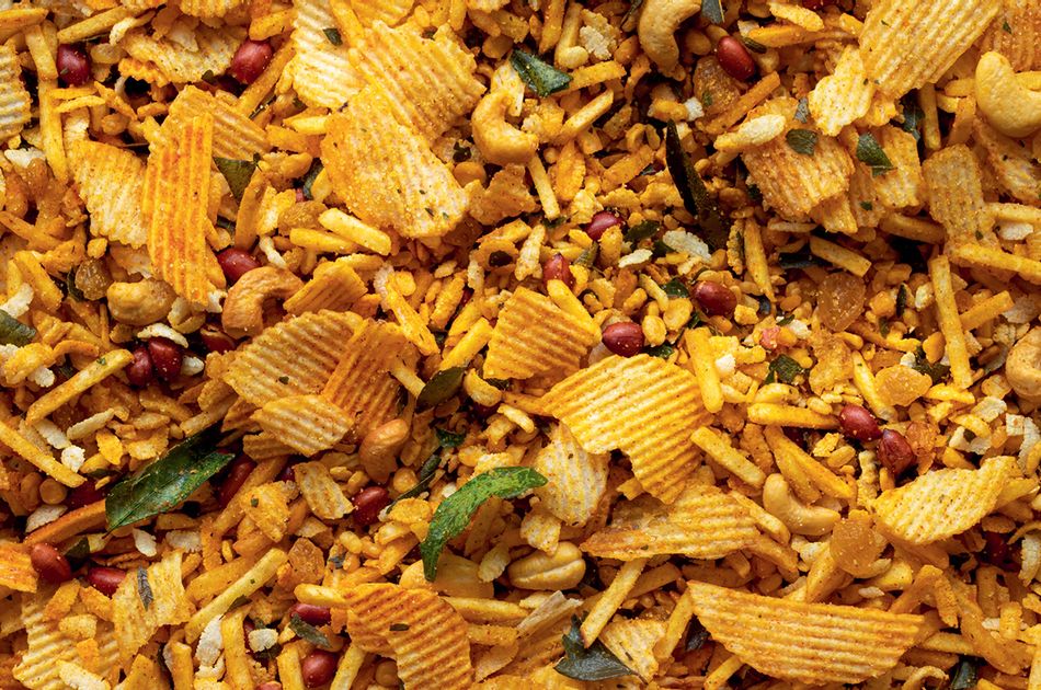 A mix of puffed rice, fried gram flour noodles, nuts, fried daal, spices and more.