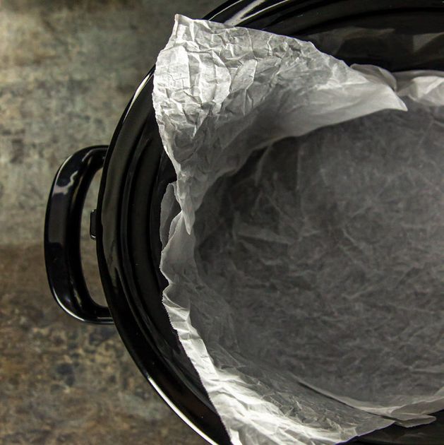 Lining the slow cooker with parchment paper makes cleanup a breeze and helps with taking the food out after cooking (like using the corners of the paper to lift items like brownies right out without a fuss). I know fitting a piece of flat parchment into the slow cooker can be a bit of a pain, so I have a neat trick to share with you that makes lining so much easier.