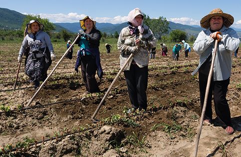 Women hoeing around baby vines at the Scientific Research Centre of Agriculture