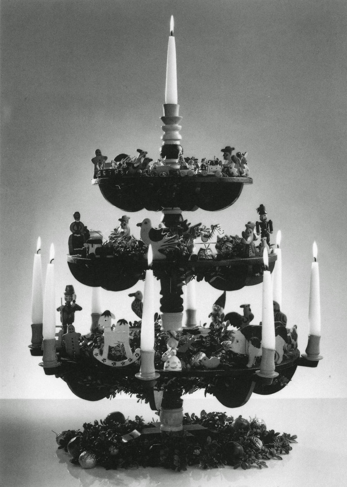 There is great variety in the types of designs used for these wooden structures, from simple affairs made of four short poles, teepee fashion, to “trees” with elaborate wood turnings and little cups to hold candles. The Leuchterstand pictured is a type of pyramid known to have been made by the Moravians in Pennsylvania. It is constructed of 56 interlocking pieces of wood. There are no nails or pegs holding it together. A similar pyramid, dating from the eighteenth century, is in the Museum of Folk Art at Dresden, East Germany.