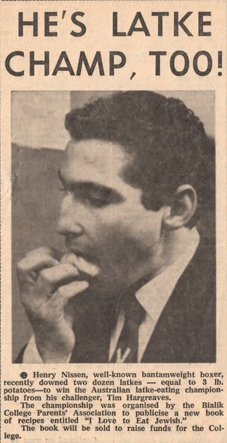 Champion boxer Henry Nissen winning the latke-eating competition that helped promote the cookbook, 1968 (courtesy Australian Jewish News).