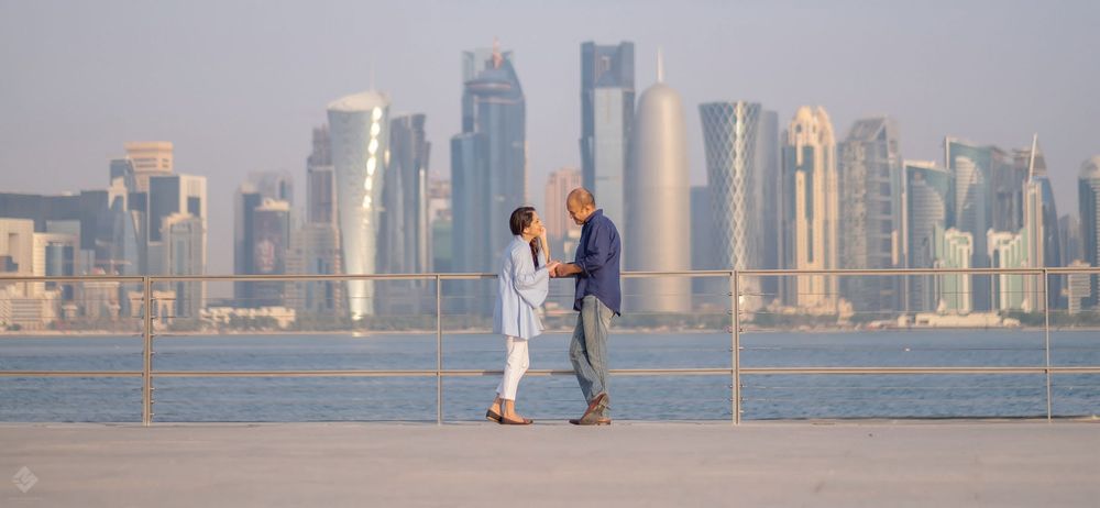 Mohsin and I against the gorgeous Doha skyline in Qatar — our home away from home